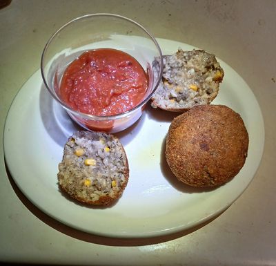 Combine the rice mix, crackers, 1/2 the cheese, poblano, and half the beaten eggs. Form 6-8 balls. (At this point, some folks refrigerate them to firm them up. We did not.) Gently, roll in the flour and dip in the other half of the eggs. Add the other half of the cheese to the bread crumbs. Coat the balls in breadcrumbs and lower into the 350 degree oil. Fry until golden brown or about 2-3 minutes. Mix the Cajun Bayou Blast into the marinara sauce and serve with those delicious Dirty Balls.