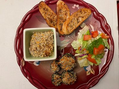 This month, we put together an appetizer plate for dinner: Mushrooms Rockafeller, Two Cheesy Crab dips with crostini, and salad.
